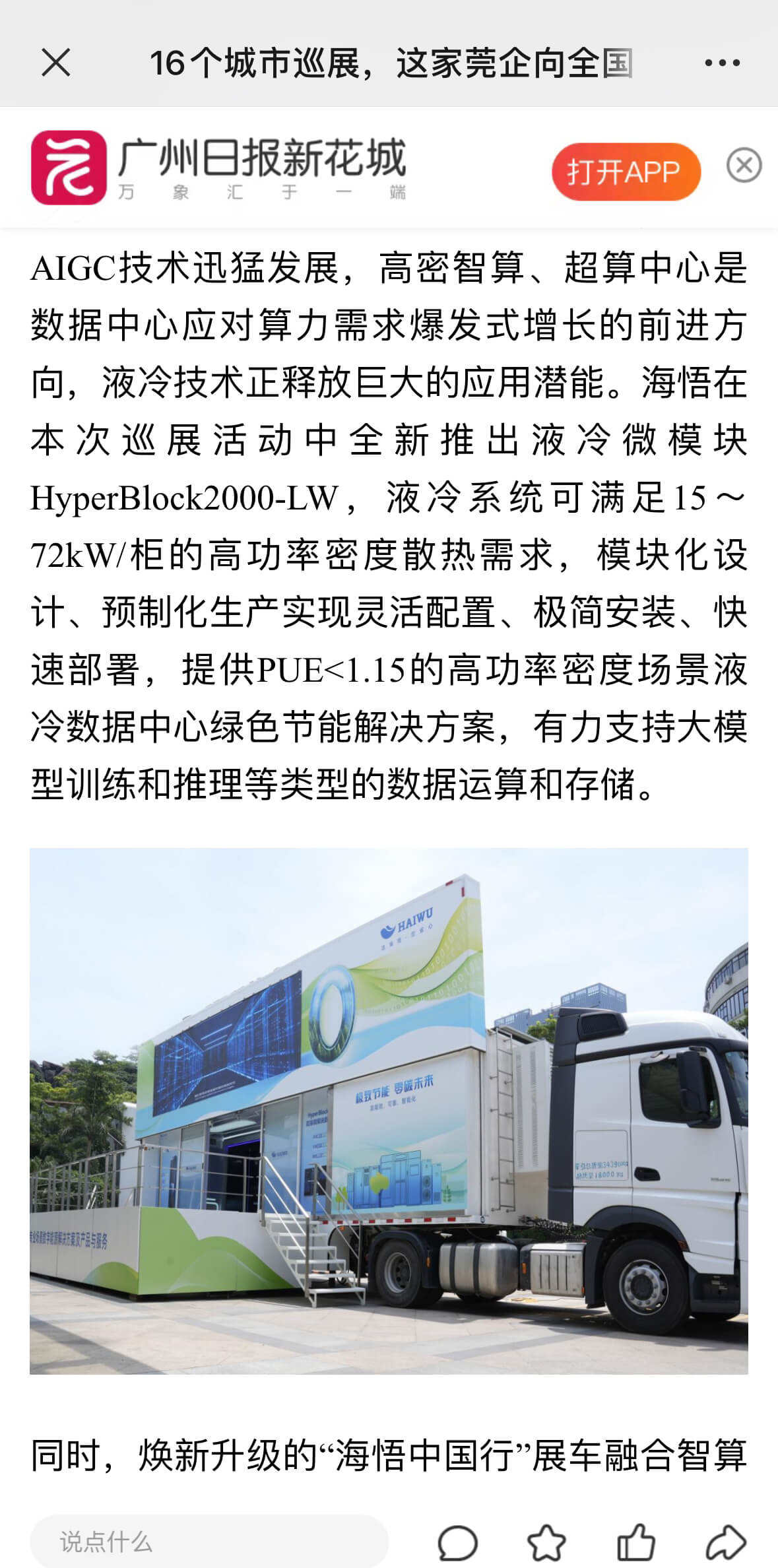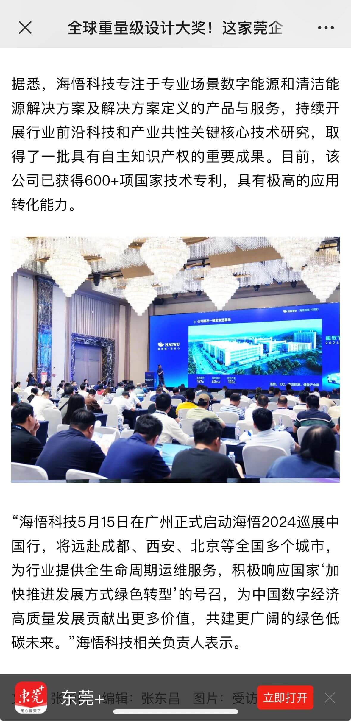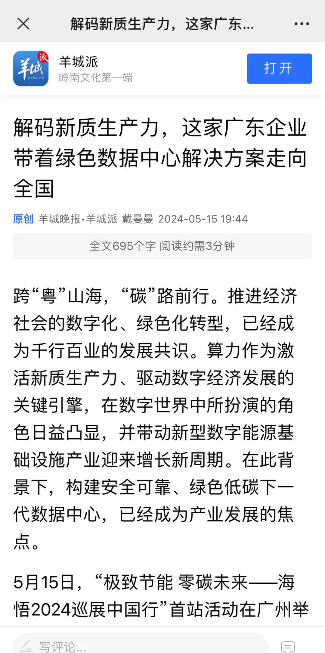 5月15日,“極致節(jié)能 零碳未來——2024海悟巡展中國行”首站活動在廣州舉行,攜先進(jìn)數(shù)據(jù)中心綠色解決方案走向全國,羊城晚報、廣州日報、東莞+、佛山+等主流媒體關(guān)注并報道,海悟的品牌實(shí)力、解決方案能力及解決方案定義的產(chǎn)品與服務(wù)都受到社會更廣泛的認(rèn)可。