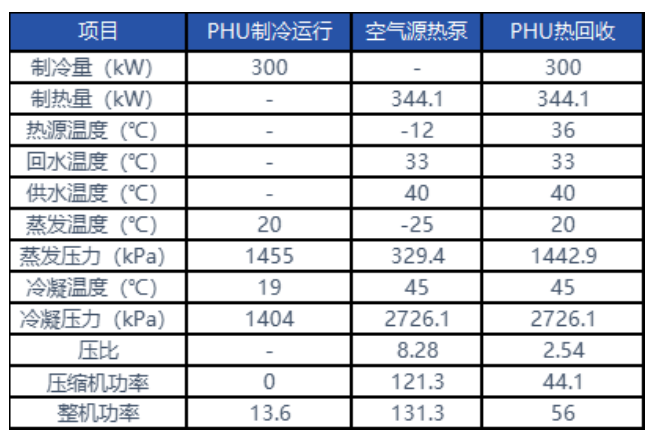 冬季采暖季節(jié), PHU熱回收機(jī)組可維持更高的蒸發(fā)溫度,利用小壓比壓縮機(jī),以極致的效率產(chǎn)出熱能,整機(jī)制熱能效比空氣源熱泵機(jī)組有顯著提升,從下面的對(duì)比表里可以一探端倪: