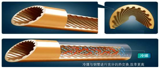 需要進一步強化耐高寒空氣源熱泵的內(nèi)部換熱,縮小應傳熱推動力不足而擴大的冷凝溫度與蒸發(fā)溫度的差值,提高主機的?效率。由于更低環(huán)溫對應更低的冷媒蒸汽壓,相應造成氣相部分在蒸發(fā)器管道內(nèi)的流速增加,但同時又受到摩擦阻力和聲速限制,更會造成蒸發(fā)器管道內(nèi)壁的換熱效能未被充分發(fā)揮。因此,需要為蒸發(fā)器選擇新型的管材,比傳統(tǒng)帶梯形槽的強化換熱管或者更早期采用的光管,更有利于在高寒地區(qū)工作。