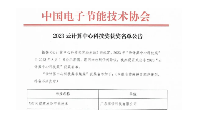 近日,中國(guó)電子節(jié)能技術(shù)協(xié)會(huì)公布了“2023年云計(jì)算中心科技獎(jiǎng)”獲獎(jiǎng)名單,海悟AHU間接蒸發(fā)冷卻節(jié)能機(jī)組憑借卓越的創(chuàng)新實(shí)力,在眾多評(píng)選技術(shù)項(xiàng)目中脫穎而出,榮獲“云計(jì)算中心科技獎(jiǎng)-卓越獎(jiǎng)”。協(xié)會(huì)將于2023年8月9日在中國(guó)數(shù)據(jù)中心市場(chǎng)年會(huì)上進(jìn)行隆重的頒獎(jiǎng)儀式。