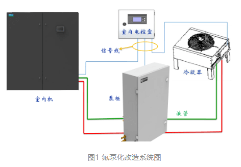 氟泵技術(shù)自08年在我國應(yīng)用以來,從其利用自然冷源節(jié)能原理到長期實(shí)踐的節(jié)能效果都獲得了行業(yè)內(nèi)的高度認(rèn)可。近年來,運(yùn)營商對于氟泵類空調(diào)的選用頻率在逐年增加,主要用于新建機(jī)樓的配置和存量機(jī)樓老舊空調(diào)的替換。但對于存量機(jī)樓內(nèi)只使用了2~4年的風(fēng)冷空調(diào),出于經(jīng)濟(jì)性等因素考慮直接做替換顯然不切實(shí)際,所以就需要用到投資小的改造方案—氟泵化改造。