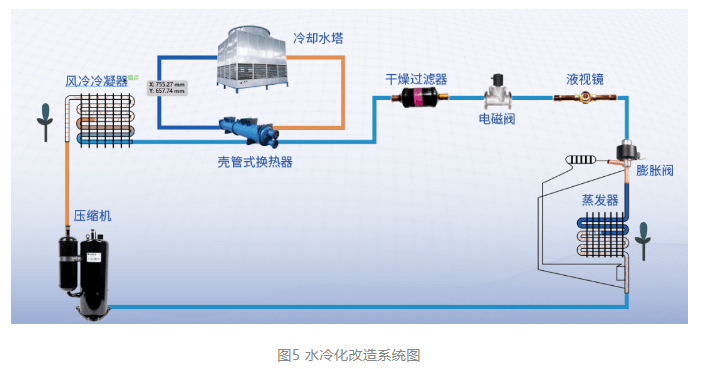 改造原理:水冷化通俗理解就是將熱介質(zhì)(冷媒)流動(dòng)的管道浸沒在冷介質(zhì)(涼水)中,或者流動(dòng)的熱介質(zhì)與流動(dòng)的冷介質(zhì)之間間隔高效傳熱的熱導(dǎo)體,熱介質(zhì)與冷介質(zhì)之間不直接相容混合,通過導(dǎo)熱間壁將熱介質(zhì)的熱量傳遞給冷介質(zhì),以降低熱介質(zhì)的溫度和壓力。具體實(shí)施是在空調(diào)室外機(jī)冷凝器出口側(cè)串聯(lián)水氟換熱器,冷媒通過換熱器將熱量傳遞給水,水側(cè)依靠水泵驅(qū)動(dòng)循環(huán)將熱量帶到冷卻塔進(jìn)行散熱。