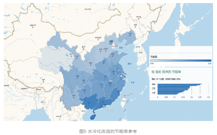 與氟泵化改造相反,水冷化改造的節(jié)能效果是從北到南逐漸提高。這是由于北部地區(qū)的低溫天氣較多,風(fēng)冷室外機(jī)的開啟頻率相對較低,冷凝溫度處于正常范圍,水冷化改造的節(jié)能效果就會(huì)降低。