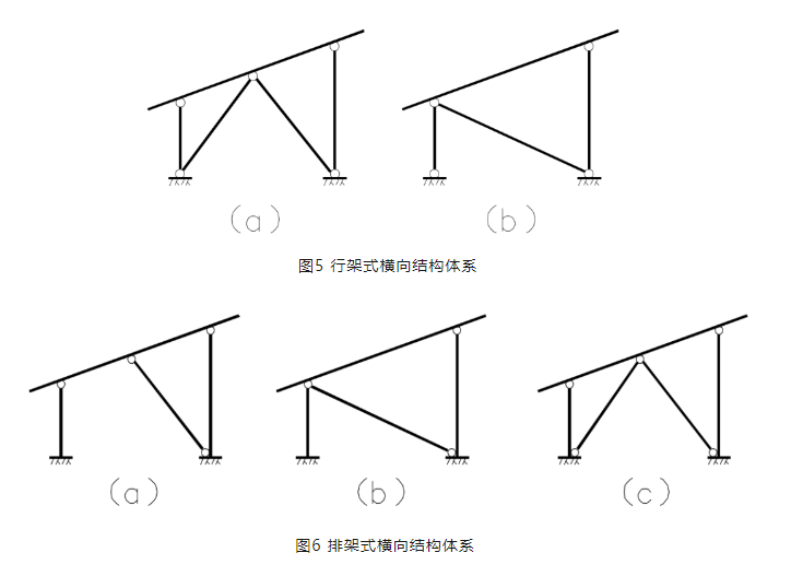 圖4所示支架橫向結(jié)構(gòu)可根據(jù)立柱與基礎(chǔ)連接形式的不同,分為兩種結(jié)構(gòu)體系,柱底鉸接和柱底固結(jié)的形式。柱底鉸接形式為行架式橫向結(jié)構(gòu)體系,柱底固結(jié)為排架式橫向結(jié)構(gòu)體系。圖5所示兩種形式均為行架式橫向結(jié)構(gòu)體系,該結(jié)構(gòu)體系前后立柱與基礎(chǔ)采用鉸接的形式,并且采用一根或者兩根橫向支撐提供側(cè)向剛度,形成穩(wěn)定的結(jié)構(gòu)不變體系。圖6所示三種形式均為排架式橫向結(jié)構(gòu)體系,該結(jié)構(gòu)體系前后立柱與基礎(chǔ)采用固結(jié)的形式,并且采用一根或兩根縱向支撐提供側(cè)向剛度,增強結(jié)構(gòu)的抗側(cè)力穩(wěn)定性。基礎(chǔ)設(shè)計同傳統(tǒng)光伏支架。