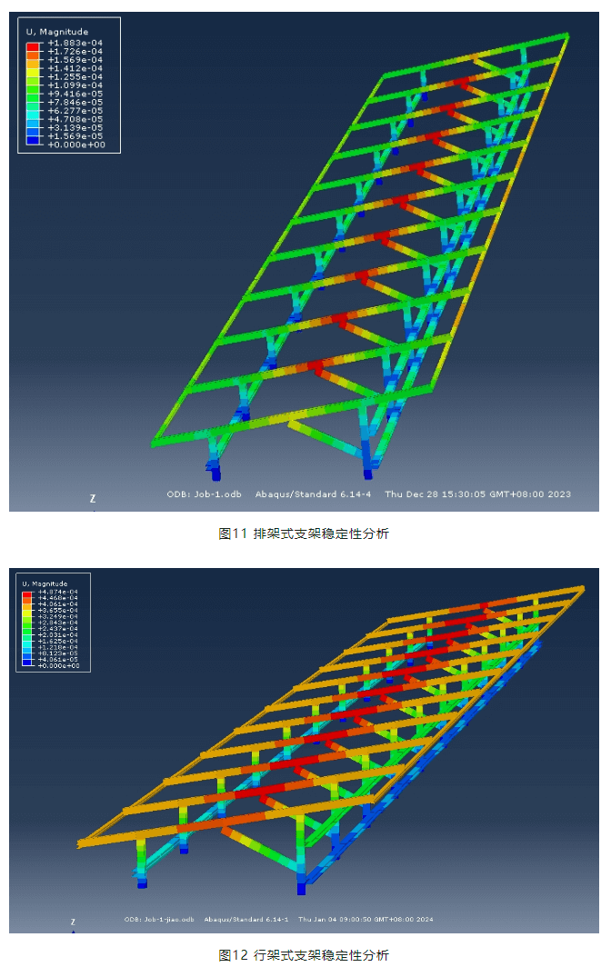 為驗證支架整體的穩(wěn)定性和承載能力,通過ABAQUS有限元軟件對支架進行仿真。根據(jù)《建筑結(jié)構(gòu)荷載規(guī)范》及《光伏發(fā)電站設(shè)計規(guī)范》,以河南鄭州項目為例,該地區(qū)25年基本風壓為0.38kn/m2,通過本文4.1條調(diào)整后風壓取值0.72kn/m2。通過面荷載施加給支架體系。圖11及圖12分別為排架式和行架式支架整體仿真結(jié)果,結(jié)果顯示風壓產(chǎn)生的結(jié)構(gòu)橫梁最大位移分別約0.19mm、0.49mm,小于橫梁計算跨度的1/250,滿足《光伏發(fā)電站設(shè)計規(guī)范》(GB50797-2012)。風壓產(chǎn)生的柱側(cè)側(cè)移分別為0.1mm、0.36mm,小于柱高的1/60,同樣滿足規(guī)范要求。因此結(jié)構(gòu)整體穩(wěn)定性符合要求。
