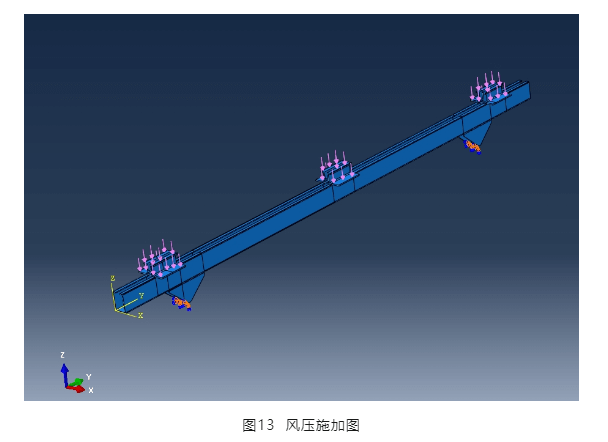 為驗證壓塊與橫梁節(jié)點部位的受力,取一根橫梁采用三維應(yīng)力單元進行仿真分析。風荷載施加到壓塊上,通過壓塊傳遞給橫梁,三角連接件底部設(shè)置固定支座,見圖13,橫梁通過三角支座固定。