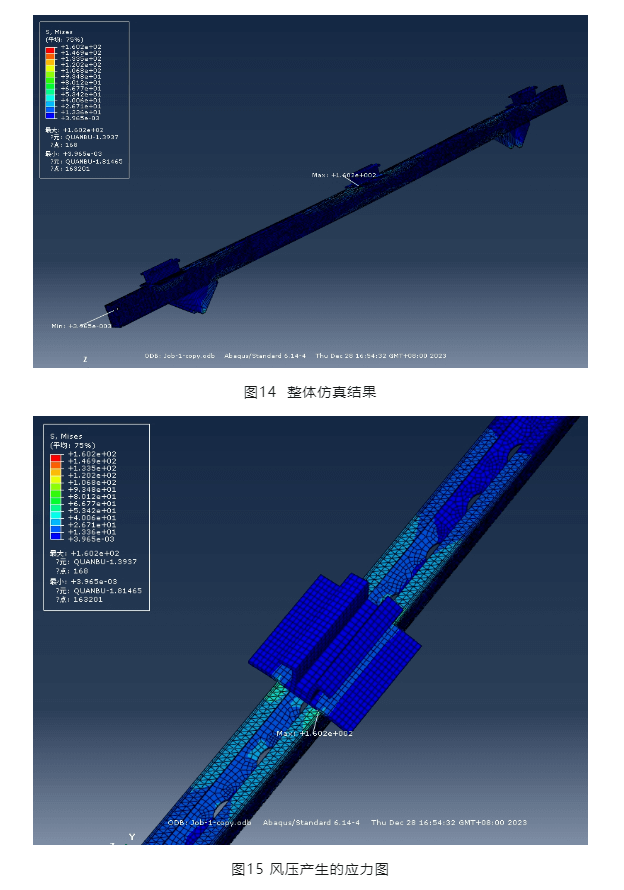 設(shè)計規(guī)范要求,支架采用的螺栓均固定擰緊。因此,各部分可視為緊密結(jié)合,不產(chǎn)生滑移,采用共單元節(jié)點進行仿真分析。通過圖14及圖15可以看出,風壓產(chǎn)生的最大應(yīng)力在橫梁上,為160.2MPA,小于鋼材強度設(shè)計值215MPA。