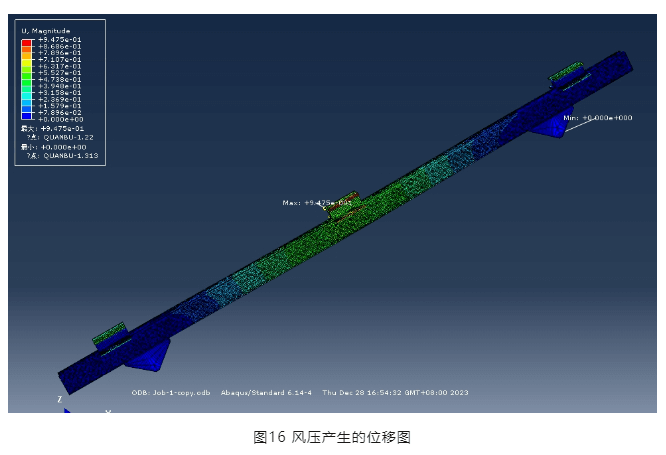 從圖16可以看出,風壓產(chǎn)生的最大位移為0.95mm(特別指出該位移與圖11、12所示位移不同,是因為荷載施加方式不同,圖11及圖12僅為驗證結(jié)構(gòu)體系整體穩(wěn)定性,因此荷載采取沿橫梁施加線荷載的方式),橫梁截面無翹曲,因此,該創(chuàng)新壓塊節(jié)點滿足強度要求。