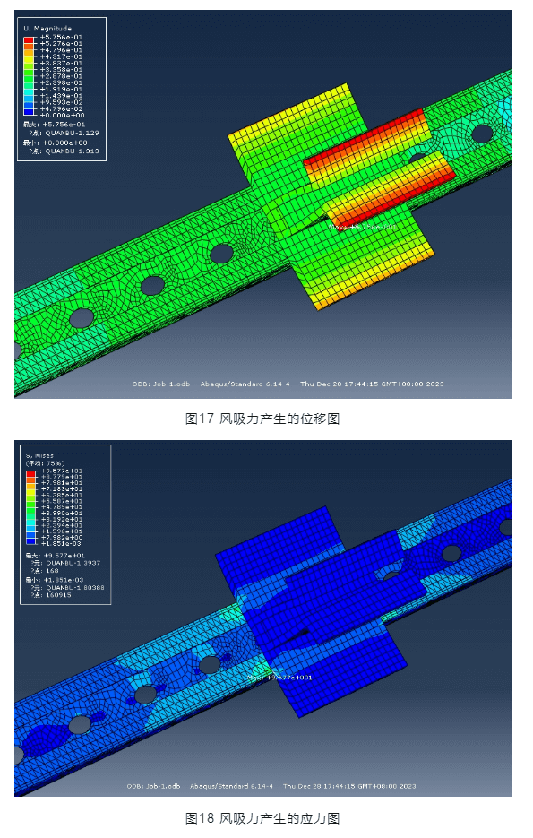 圖17及圖18為風吸力作用下,節(jié)點與橫梁的位移和應(yīng)力圖。最大位移發(fā)生在壓塊上,為0.58mm,最大應(yīng)力發(fā)生在橫梁上為96MPA,同樣小于鋼材強度設(shè)計值215MPA。因此,風吸力作用下,節(jié)點和橫梁同樣滿足強度要求。