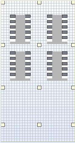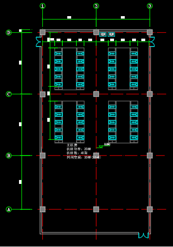根據(jù)設計方案部署4個相同的雙排微模塊,每個微模塊分別部署10(8+2)臺列間級精密空調,共40(32+8)臺。列間級精密空調單機冷量:35kW;額定風量:8000m³/h;空調設備控制22℃送風,35℃回風;空調背面回風,正面出風;數(shù)量總計40臺。每座微模塊默認位置共10架IT機架,IT機架負載25kW /rack ,機房總計40架IT機架;微模塊封閉冷通道,冷通道寬1.8m。該方案布置方案如下圖: