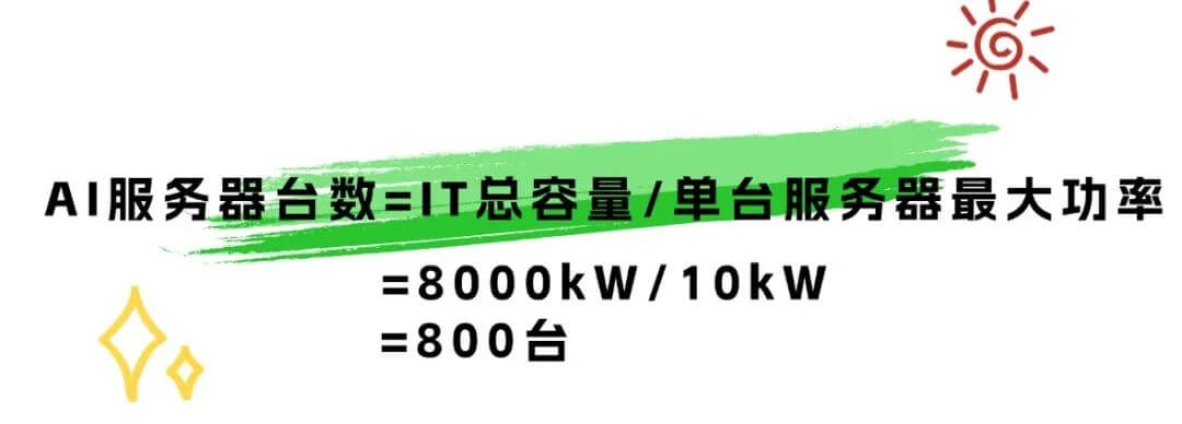 首先我們應(yīng)選定一款A(yù)I服務(wù)器,查看它的用電功率。以H100 GPU 服務(wù)器為例:CPU耗電約 300W*2,內(nèi)存16根耗電約 250W,硬盤6塊盤約200W,風(fēng)扇耗電約150W,H100GPU卡耗電約700W*8,按理論計(jì)算最大耗電量約為6800W。而以H100模組整機(jī)服務(wù)器滿配的情況下,單臺(tái)約功率約10kW。例如數(shù)據(jù)中心的IT總?cè)萘繛?000kW,計(jì)算服務(wù)器臺(tái)數(shù):