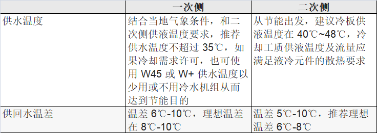 一次側(cè)冷源有多種組成形式,需根據(jù)當(dāng)?shù)厥彝猸h(huán)境溫度 (包括干球 / 濕球溫度) 及液冷服務(wù)器的進(jìn)液溫度,確定是否需要下調(diào)水溫;另外供水溫度應(yīng)比室內(nèi)露點(diǎn)溫度高出 2℃ ~ 3℃ 左右,以防結(jié)露 (見(jiàn)表 1)。