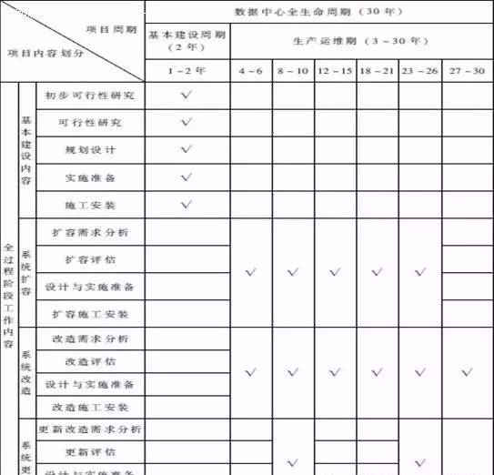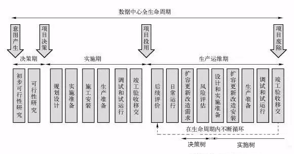 為了更好地區(qū)分各個建設(shè)階段,我們引入"數(shù)據(jù)中心基本建設(shè)周期"概念,是指:自項目開始至項目基本建設(shè)完成并達(dá)到預(yù)先規(guī)劃要求,數(shù)據(jù)中心可以提供正常運(yùn)營使用為止的一個周期。這也就是建設(shè)項目決策期和實施期的內(nèi)容,不包含后期數(shù)據(jù)中心生產(chǎn)運(yùn)營期內(nèi)的擴(kuò)容、更新和改造等內(nèi)容。
