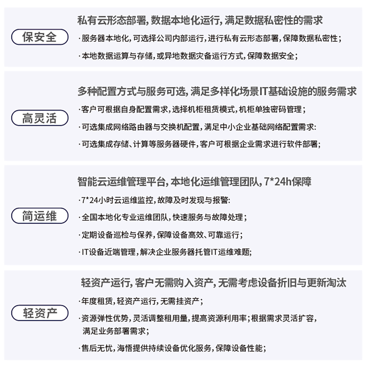 海悟云“云邊驛站”是專為中小型企業(yè)、商超物流、小型醫(yī)療機(jī)構(gòu)、分支網(wǎng)點(diǎn)、MES制造等輕資源需求場(chǎng)景設(shè)計(jì)的私有數(shù)據(jù)機(jī)房托管服務(wù)方案。該方案聚焦于中小型企業(yè)的私有云數(shù)據(jù)底座,提供機(jī)柜、UPS配電和服務(wù)器等基礎(chǔ)設(shè)施,助力企業(yè)輕松構(gòu)建近端私有云,實(shí)現(xiàn)數(shù)據(jù)的本地化存儲(chǔ)與管理。