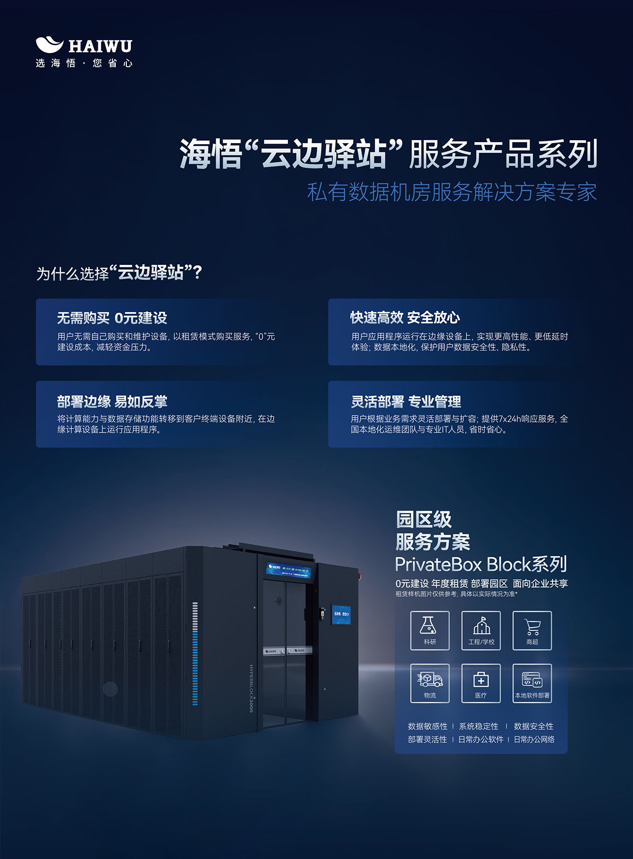 針對(duì)中小型企業(yè)資源有限的特點(diǎn),海悟云“云邊驛站”提供靈活的部署方案。企業(yè)可根據(jù)自身需求,選擇適合的機(jī)柜數(shù)量與配置,實(shí)現(xiàn)資源的最大化利用。 -