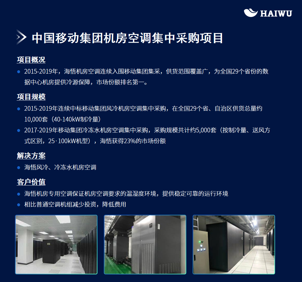 自2015年至2019年,海悟機(jī)房空調(diào)連續(xù)入圍中國移動集團(tuán)集采名單,供貨范圍覆蓋全國29個省份的數(shù)據(jù)中心機(jī)房,市場份額遙遙領(lǐng)先。這一輝煌成就的背后,是海悟?qū)軝C(jī)房空調(diào)末端技術(shù)的深刻理解和精準(zhǔn)把握。海悟通過實現(xiàn)機(jī)柜級就近制冷,大幅縮短了空調(diào)送風(fēng)距離,有效解決了局部熱點問題,為中國移動數(shù)據(jù)中心園區(qū)提供了穩(wěn)定可靠的運(yùn)行環(huán)境。