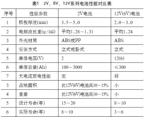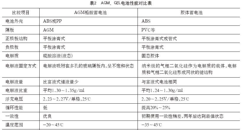 作為后備用途的VRLA電池按單體電壓等級分為2V、6V、12V等系列。按固定電解液的方式可分為AGM(超細(xì)玻璃纖維)電池和GEL(膠體)電池,其對比分別見表1和表2。