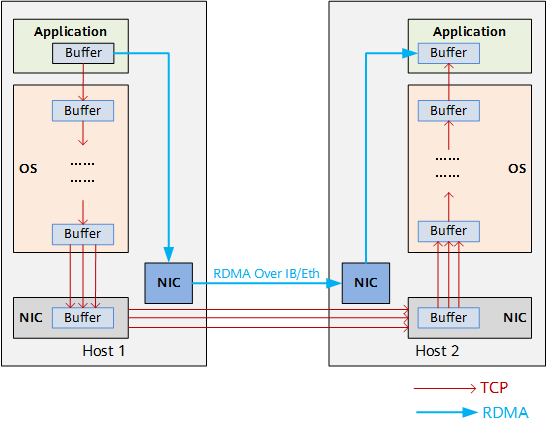 RDMA(Remote Direct Memory Access)允許應(yīng)用與網(wǎng)卡之間的直接數(shù)據(jù)讀寫,將服務(wù)器內(nèi)的數(shù)據(jù)傳輸時延降低到接近1us。同時,RDMA允許接收端直接從發(fā)送端的內(nèi)存讀取數(shù)據(jù),極大減少了CPU的負擔。