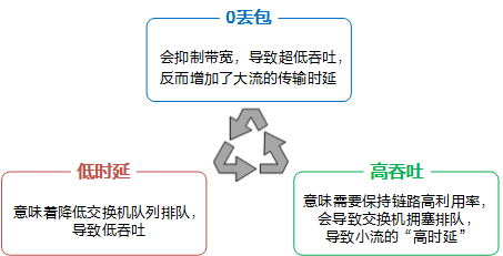 從上一節(jié)來看,為了滿足AI時代的數(shù)據(jù)高效處理訴求、應(yīng)對分布式架構(gòu)挑戰(zhàn),0丟包、低時延、高吞吐成為下一代數(shù)據(jù)中心網(wǎng)絡(luò)的三個核心指標。這三個核心指標是互相影響,有蹺蹺板效應(yīng),同時達到最優(yōu)有很大的挑戰(zhàn)。