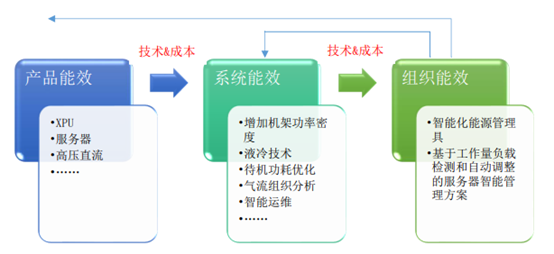數(shù)據(jù)中心整體能源效率的提高離不開其各組成設(shè)備的能效提升,或者說提升設(shè)備的能效能夠直接有效提高數(shù)據(jù)中心的能效,例如提高服務(wù)器能效、減少供電損耗等,但設(shè)備級(jí)能效提高會(huì)遇到瓶頸,到了一定程度由于技術(shù)和成本的限制,其能效無法再次提高或者提高能效造成成本急劇上升。在設(shè)備能效提升遇到困難后,通常采用提高系統(tǒng)能效的方式,例如通過負(fù)載優(yōu)化使服務(wù)器工作在高能效狀態(tài),待機(jī)服務(wù)器進(jìn)行優(yōu)化;或者通過氣流組織分析,使制冷和空調(diào)散熱在時(shí)間和空間上進(jìn)行匹配,因在系統(tǒng)能效的彈性比較大,通常從小的系統(tǒng)開始做起,逐漸引入更多變量,涉及的系統(tǒng)越來越多,同時(shí)再考慮管理因素,就成為從組織層面提高能效的方法和途徑。