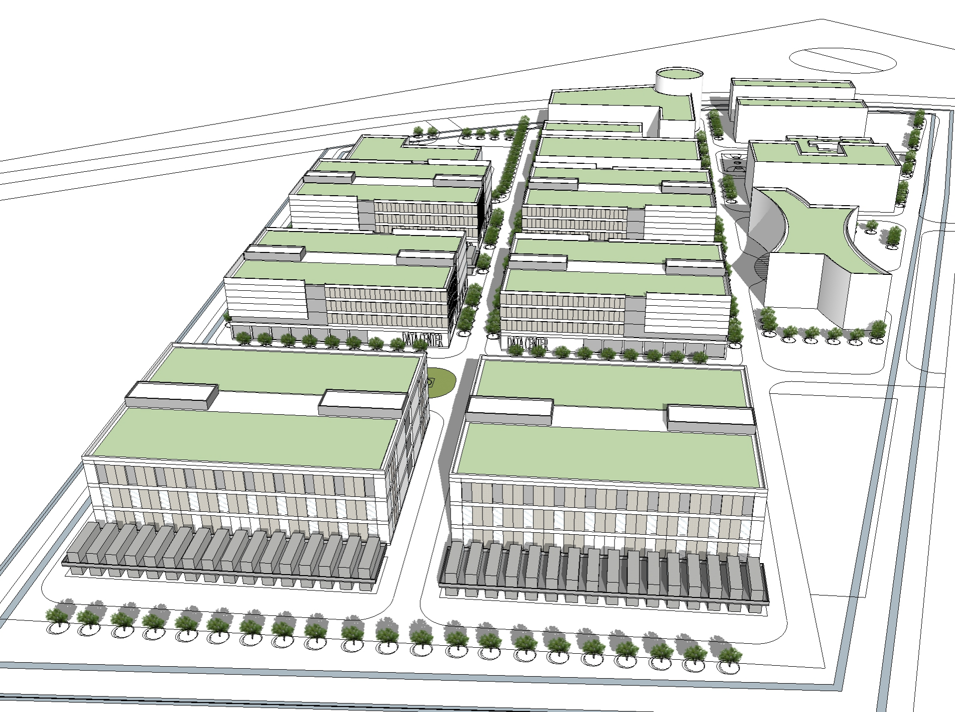 本項(xiàng)目園區(qū)位于南京,總用地面積132397.65m² ,總建筑面積184535.82m²,共設(shè)計(jì)6棟數(shù)據(jù)中心(其中4棟采用水冷方案,2棟采用間接蒸發(fā)方案)、2棟宿舍樓、1棟研發(fā)樓、1棟運(yùn)維管理中心、1棟綜合服務(wù)中心、1棟行政辦公樓、1棟作為220kV變電站。